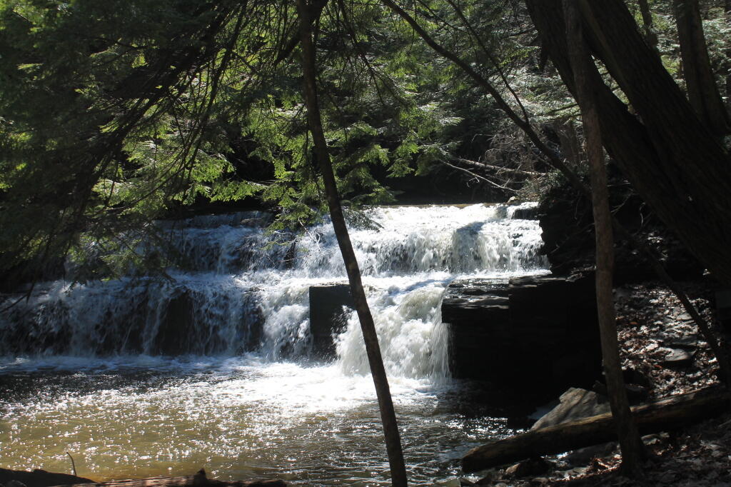 A highlight of the Christman Sanctuary is the Bozenkill, with its 30-foot waterfall and numerous lesser cascades. Alternate layers of sandstone and shale are found in the large pool at the foot of the waterfall.