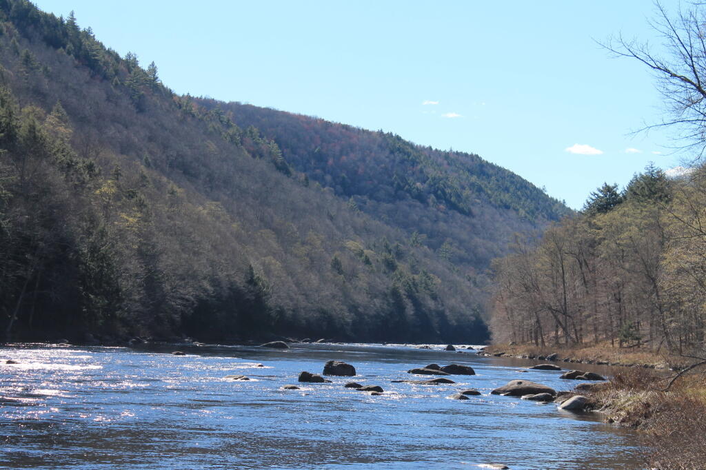 The trail to the Blue Ledges ends up at a beautiful spot on the Hudson River on the bank opposite the tall cliffs called the Blue Ledges. The cliffs rise over 300 feet and are spectacular! The river makes a right angle bend at this location and is filled with big boulders which, depending on water levels, may be well above the flow or part of a huge white water. There is also a section of sandy bank shore for those who like to wade. At the trailhead, follow the Blue DEC trail markers.