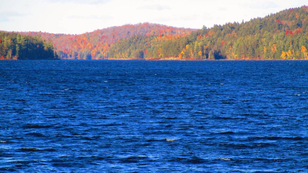 Looking out at Tupper Lake from the Bog River Bridge on NY 421 on a cold mid-autumn day, with the wind whipping across Tupper Lake, creating some white caps.