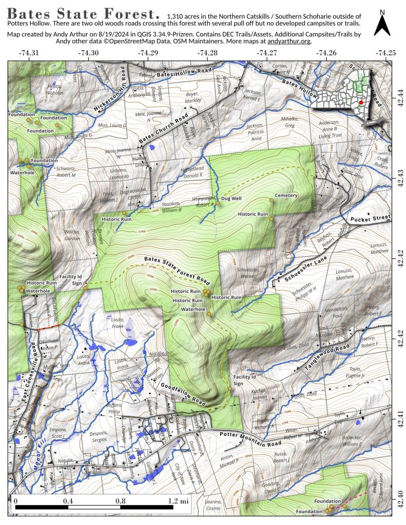 The 1,139-acre Bates State Forest was purchased for the people of New York State for reforestation, timber production, recreational use, watershed protection and wildlife habitat. Bates State Forest features hunting, trapping and primitive camping opportunities. Hiking is allowed on all state forests but there are no designated trails on this property.